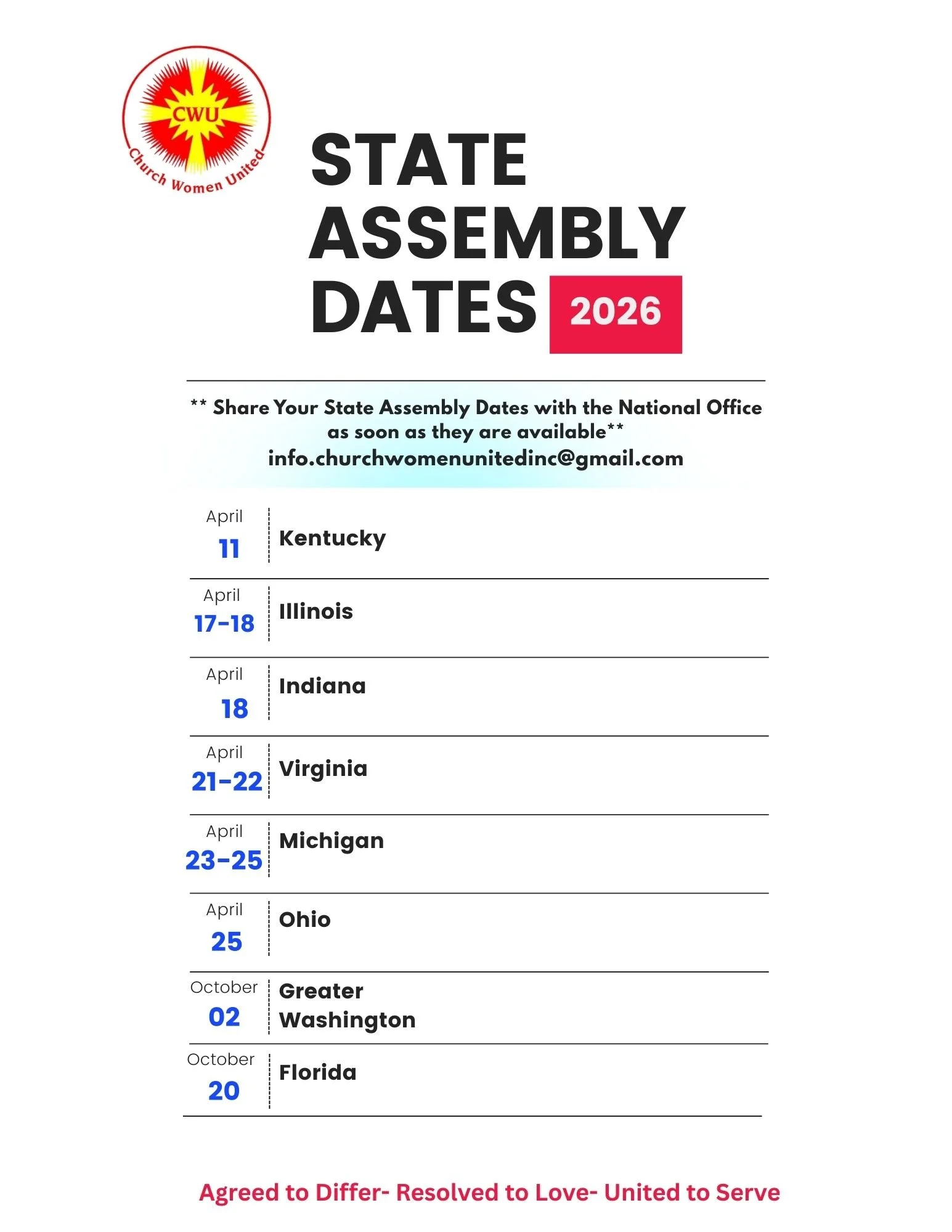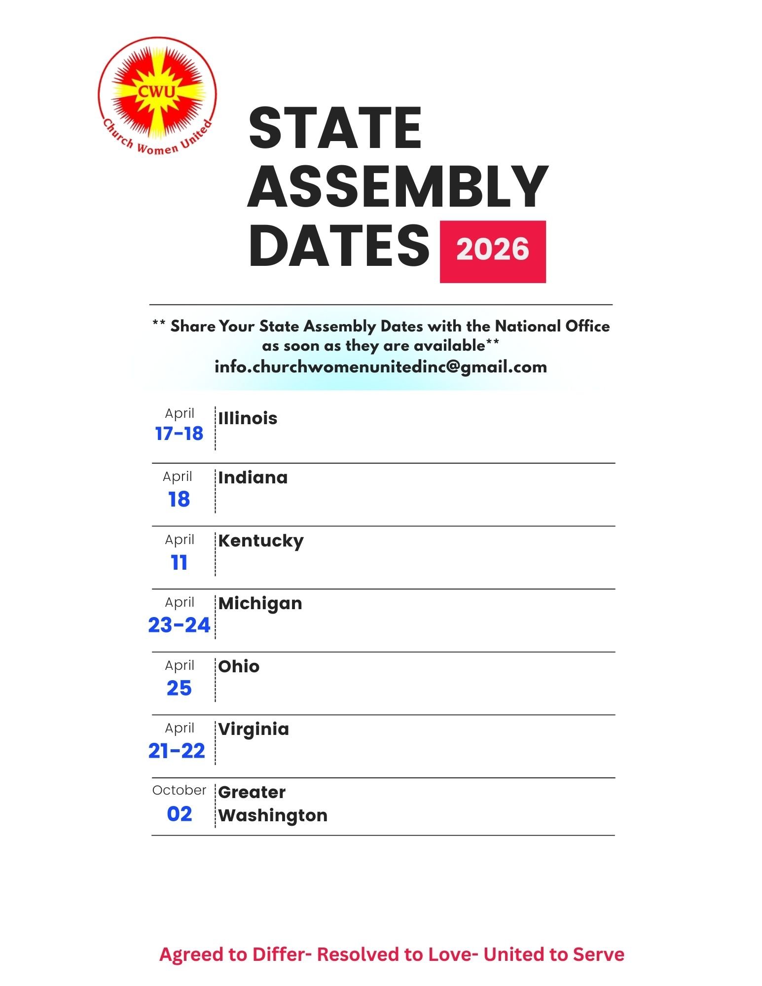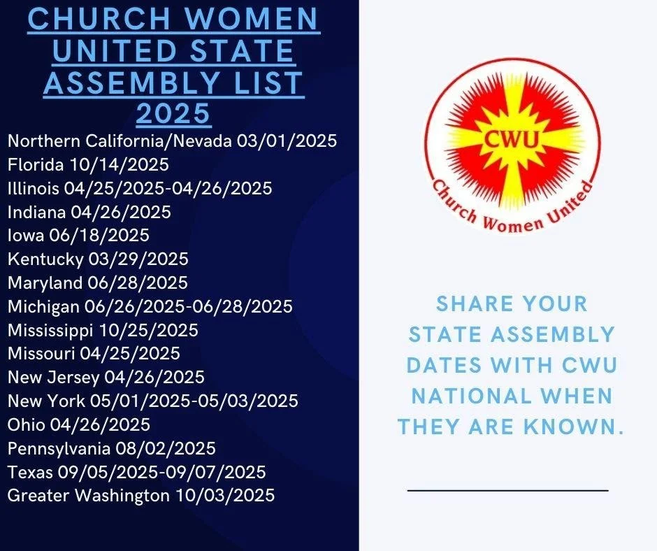 Since 1941, the Women of the Church Women United movement have held a vision of Christian unity and prayerful action. CWU was founded as a racially, culturally, theologically, inclusive Christian women’s movement to celebrate unity and diversity and work for peace in the world.